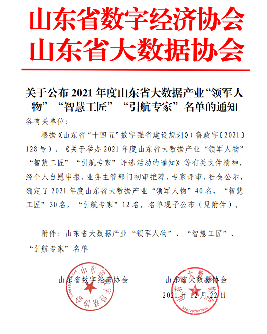 为深入贯彻国家大数据战略,促进产业示范交流,树立工作先进典型,打造人才聚集高地,弘扬劳模、工匠精神,山东省大数据协会根据《山东省“十四五”数字强省建设规划》(鲁政字〔2021〕128号)等有关文件精神,确定了2021年度山东省大数据产业“领军人物”40名,“智慧工匠”30名,“引航专家”12名。