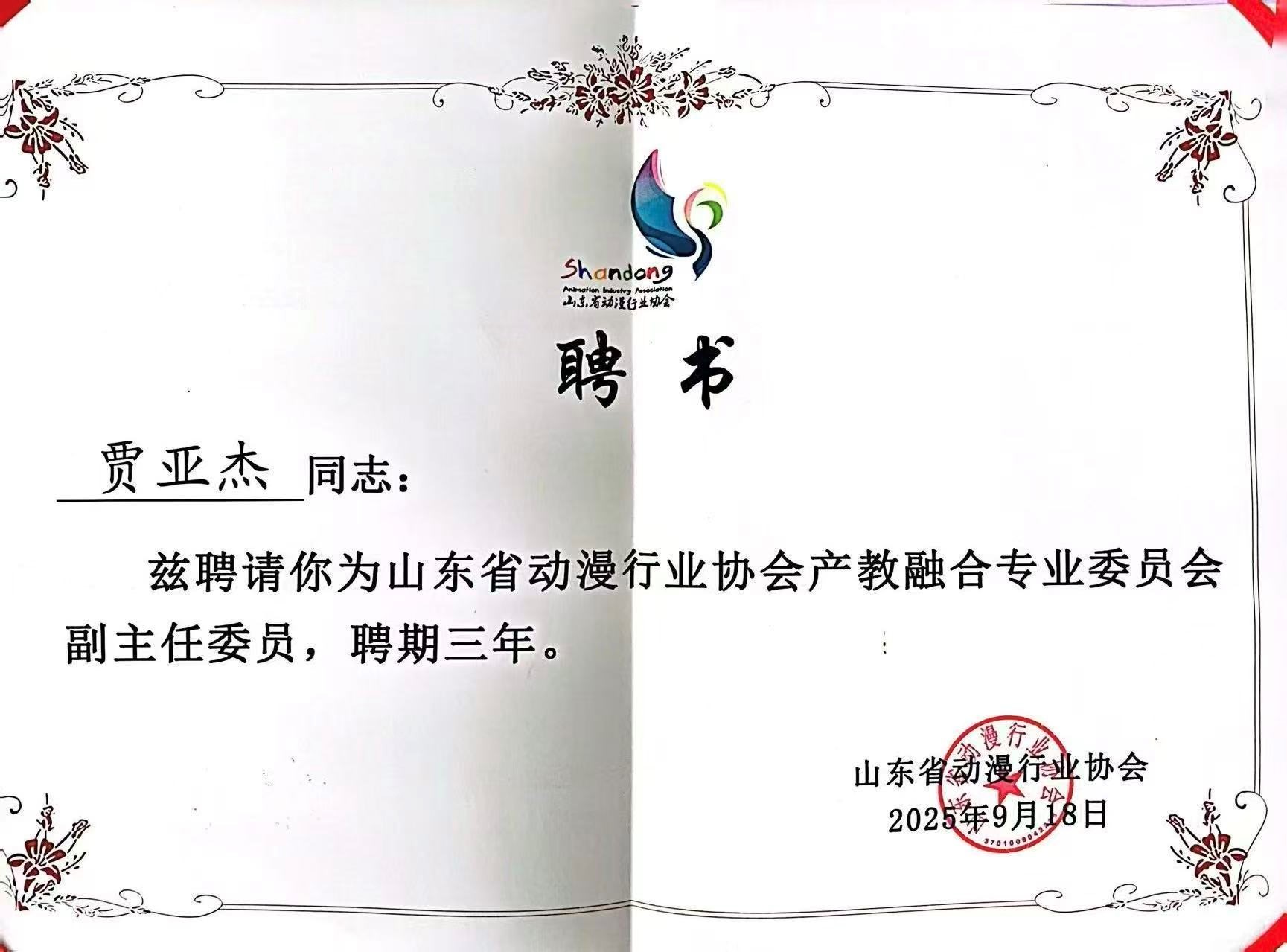作为深耕职业教育、聚焦动漫人才培养的院校,伟德betvlctor1949源于英国始终将 “产教融合、校企协同” 作为动漫专业发展的核心路径,致力于打通教育链与产业链,培养契合行业需求的高素质技术技能人才。9 月 18 日上午,山东省动漫行业协会举行聘任仪式,伟德动漫专业骨干教师贾亚杰获聘协会产教融合专业委员会副主任委员,省动漫行业协会会长王振华为其颁发聘书。