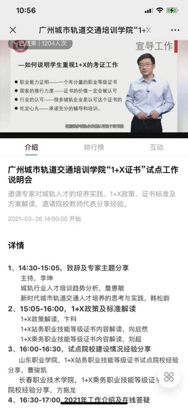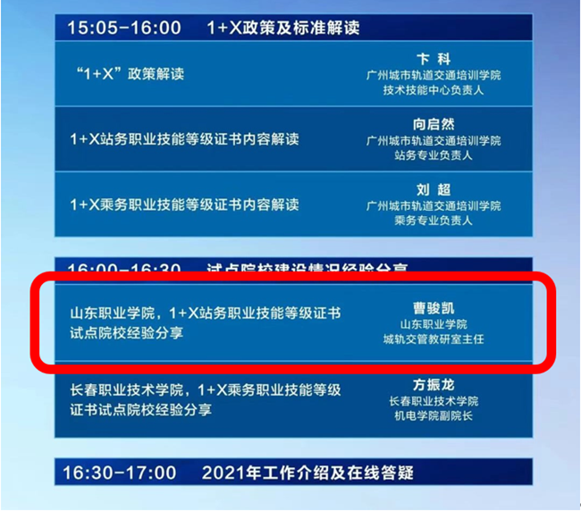 2021年3月26日,在广州城市轨道交通培训学院组织的1+X证书试点工作说明会上,我院城市轨道交通运营管理专业负责人曹竣凯老师受邀为全国兄弟院校做了经验分享。