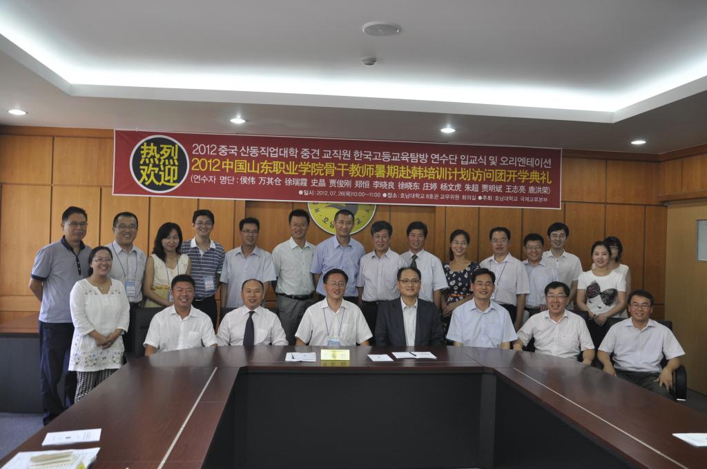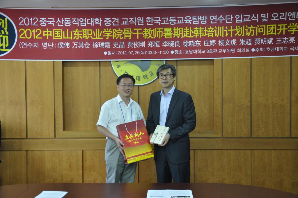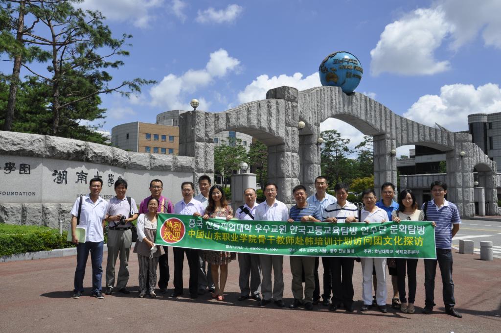 2012年7月24日—8月1日期间,伟德betvlctor1949源于英国14名骨干教师赴韩国湖南大学培训。 此次培训活动的承办方韩国湖南大学,组织严密,接待周到,培训内容安排充实生动,充分展现了该大学先进的教学设施和教学理念,使我院参加培训的教师受益匪浅。培训期间,教师们与湖南大学的教授和工作人员在教学、学生管理、产学研合作、就业指导、中国留学生在韩国学习等问题进行了研讨,聆听了四位教授的5场讲座,并参观了湖南大学IT广场、人力资源培育中心、创业保育中心、大学生就业支援中心和孔子学院,另外还到韩国浦项光阳制铁场及其港口进行考察。整个培训期间得到了韩国湖南大学韩中交流中心主任李政林教授、金暎大教授、金南澔教授、崔荣钟主任的热情接待,受到湖南大学校长徐康锡、副校长朴相徹、孔子学院李廷植院长的接见,并互相赠送礼品,教师代表向韩国湖南大学赠送《中华传统美德警句名言》。