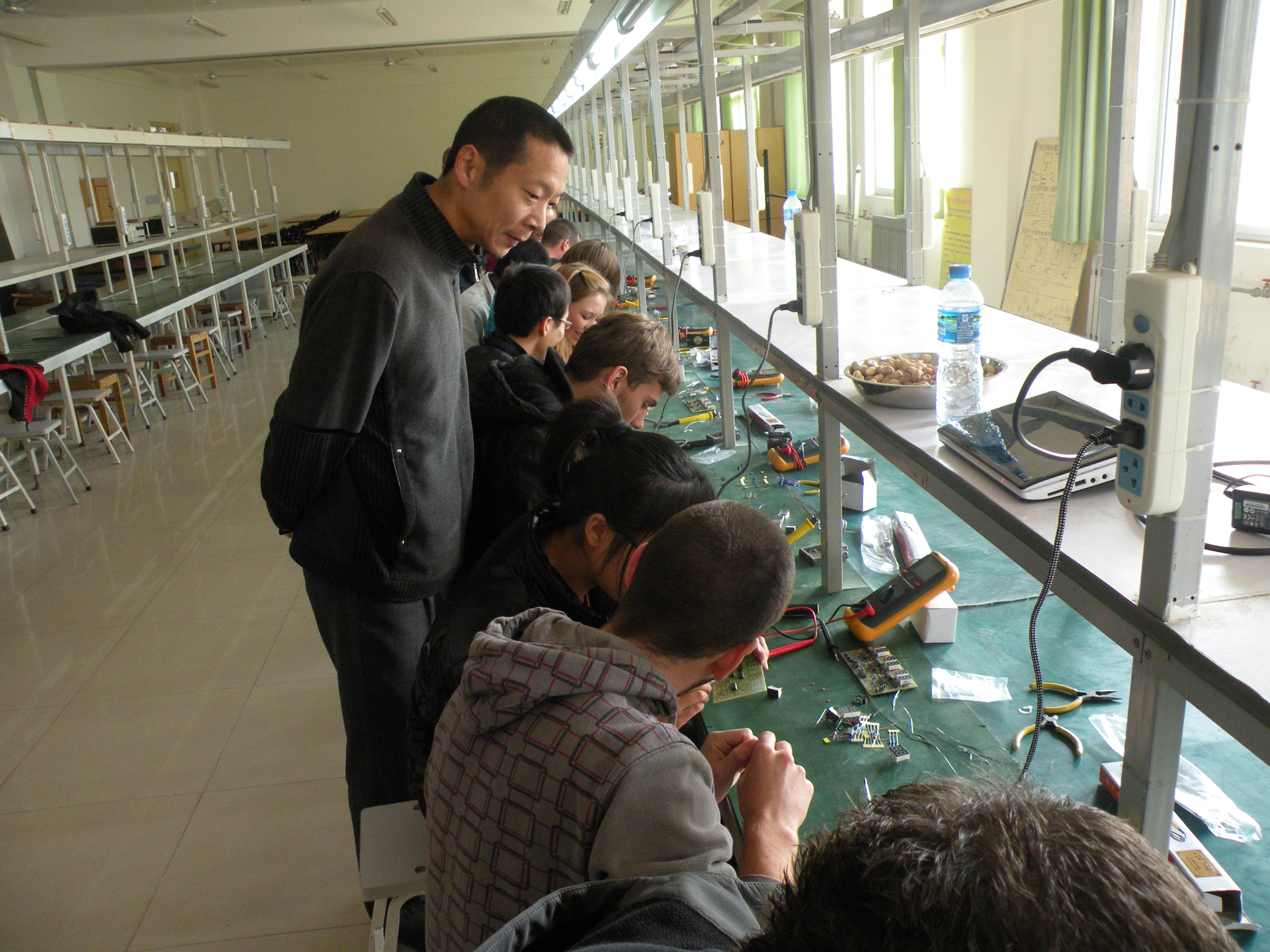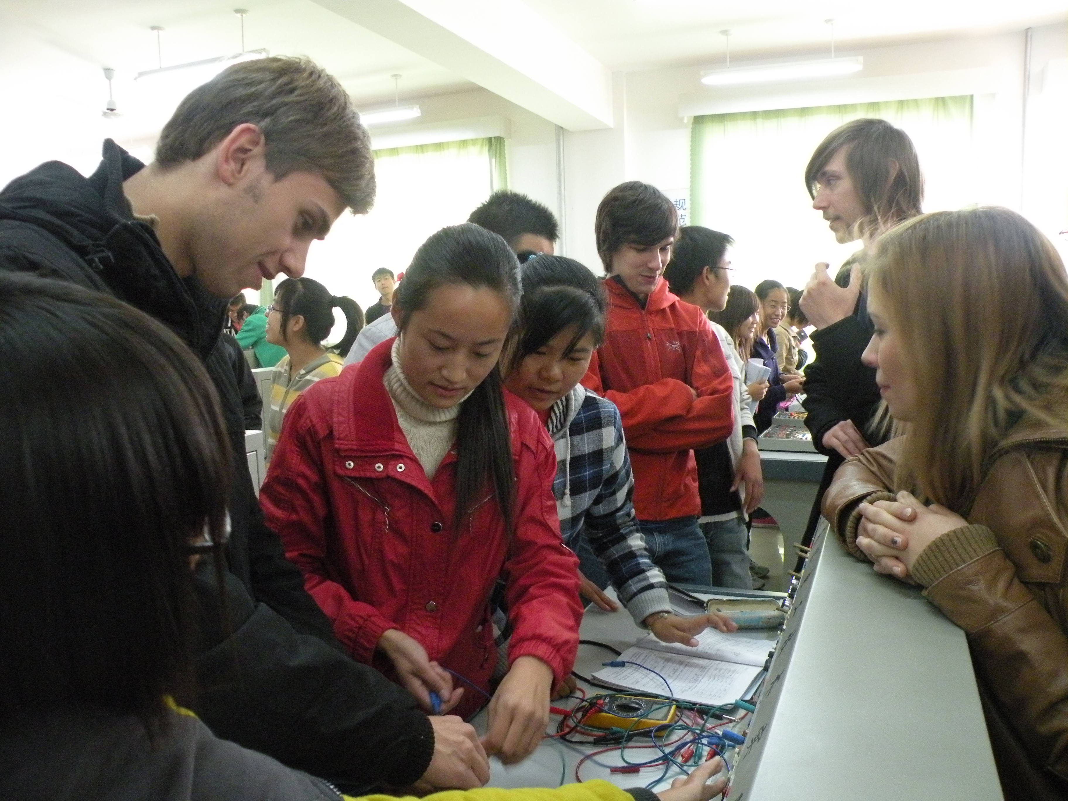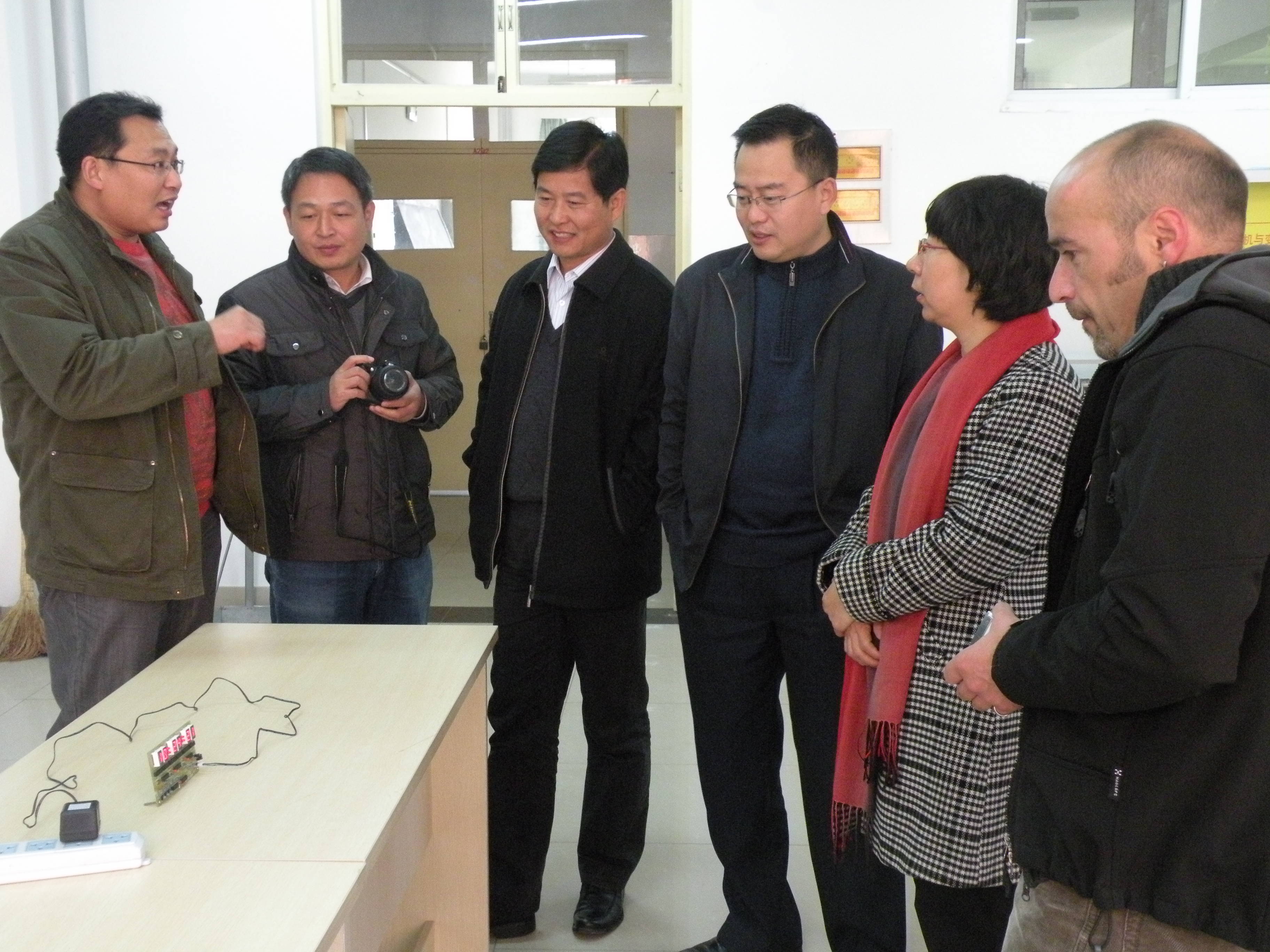 10月28日上午,德国师生到我系电工电子项目教学教室参加学习交流。在电工电子项目教学负责人刘刚老师的指导下,双方师生一起开展了《精密数钟的设计与制作》项目的教学活动。在刘刚老师与德国教师的指导下,双方同学经共同努力,成功完成了该项目的设计与制作。德国学生拿着自己的作品和我系学生一起拍照留念,幸福的笑容诠释着自己内心的喜悦。