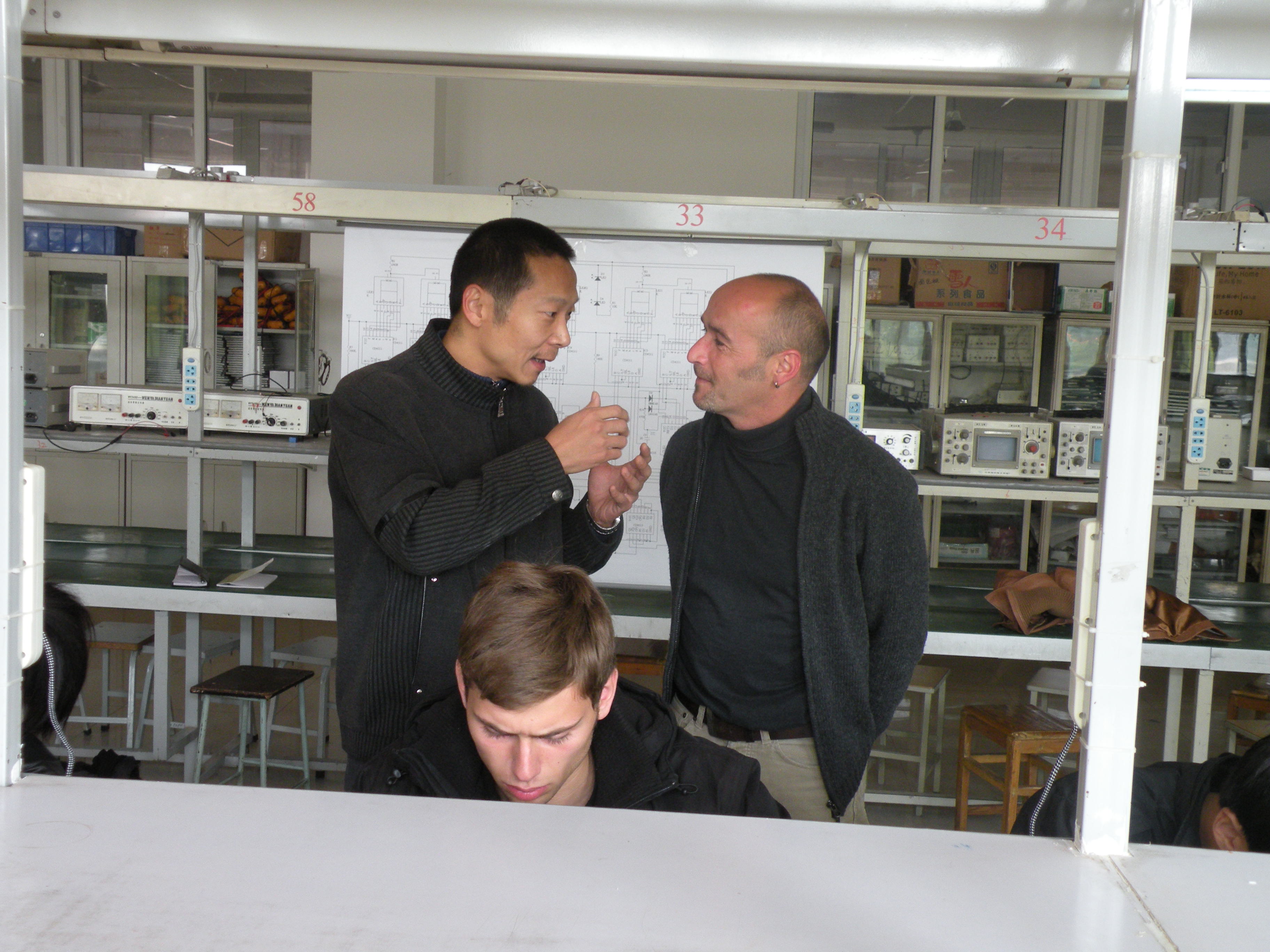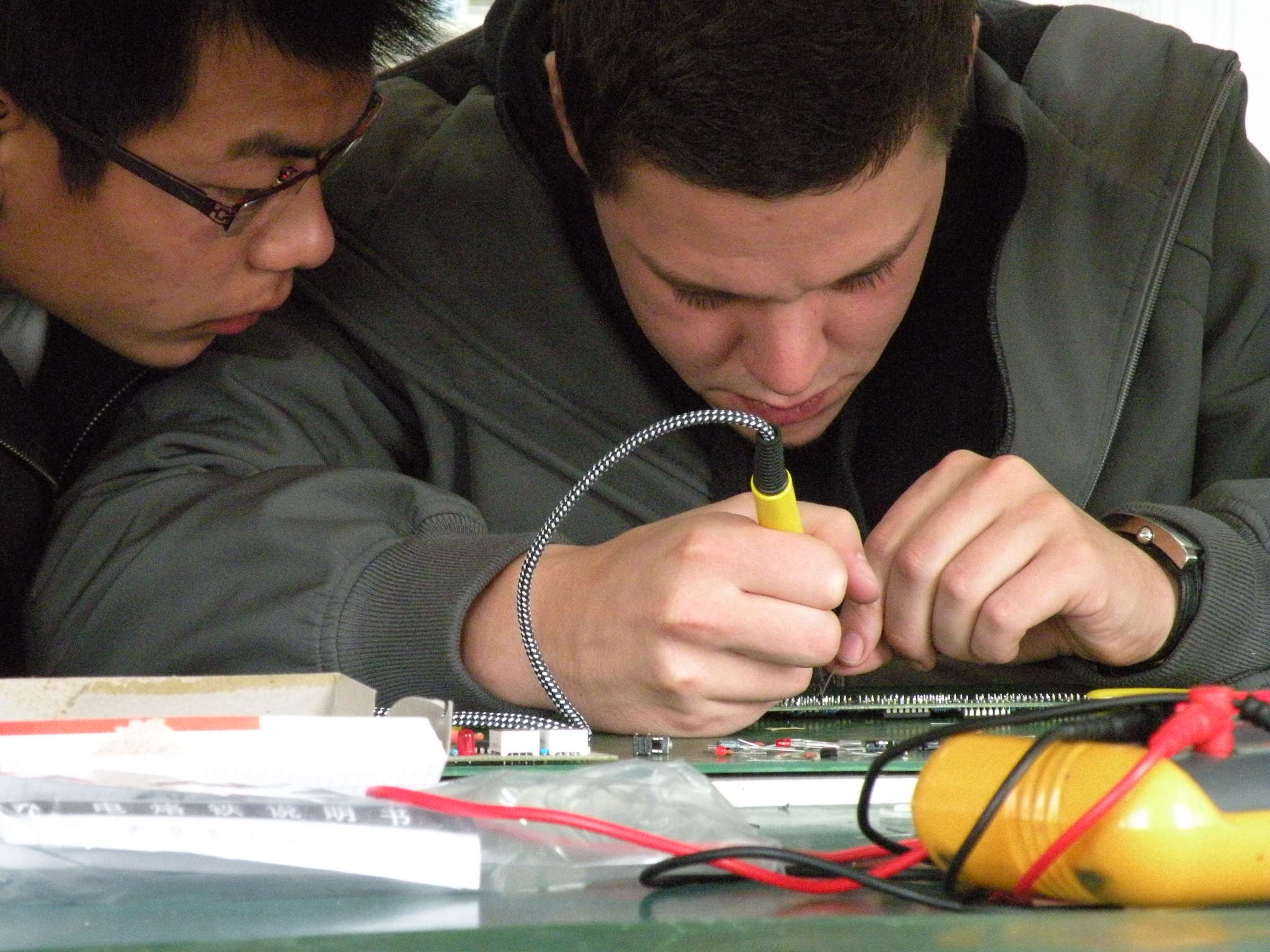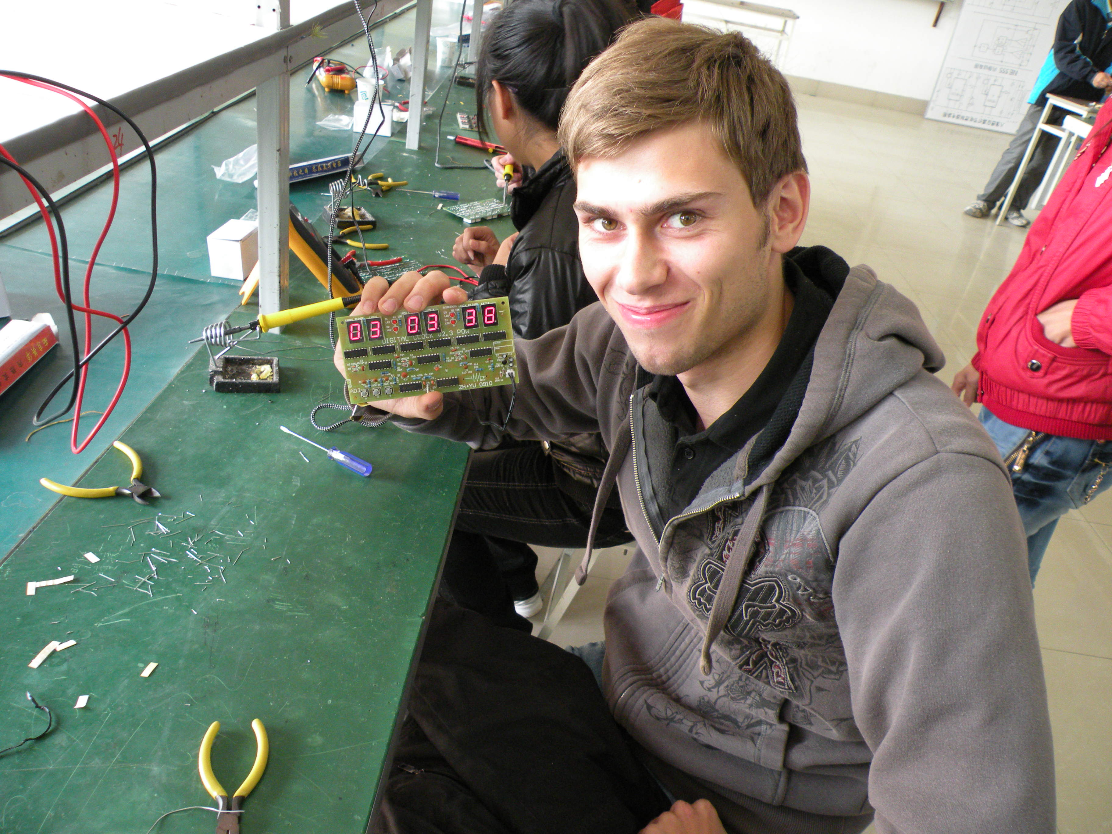 10月28日上午,德国师生到我系电工电子项目教学教室参加学习交流。在电工电子项目教学负责人刘刚老师的指导下,双方师生一起开展了《精密数钟的设计与制作》项目的教学活动。在刘刚老师与德国教师的指导下,双方同学经共同努力,成功完成了该项目的设计与制作。德国学生拿着自己的作品和我系学生一起拍照留念,幸福的笑容诠释着自己内心的喜悦。