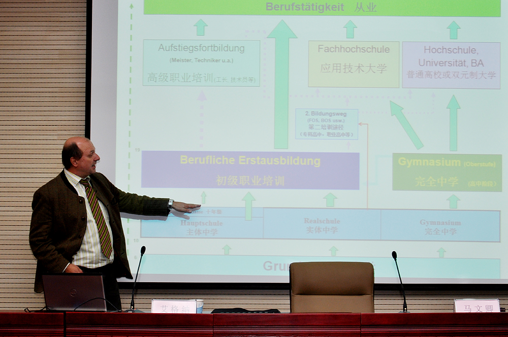 艾格纳博士在讲座中谈到,“双元制”职业教育的突出特点主要表现在:一、同生产紧密结合;二、企业的广泛参与;三、互通式的各类教育形式;四、培训与考核相分离的考核办法。区别于其它职业教育模式,德国“双元制”职业教育的特性主要表现在:一、两个学习地点——企业与职业学校;二、受训者的双重身份——学生与学徒;三、两类教师——实训教师与理论教师;四、两种指导文件——《职业培训条例》与《理论教学大纲》;五、两种教材——实训教材与理论教材;六、两种考试——实训技能考试与专业知识考试;七、经费的两条渠道——企业与国家。