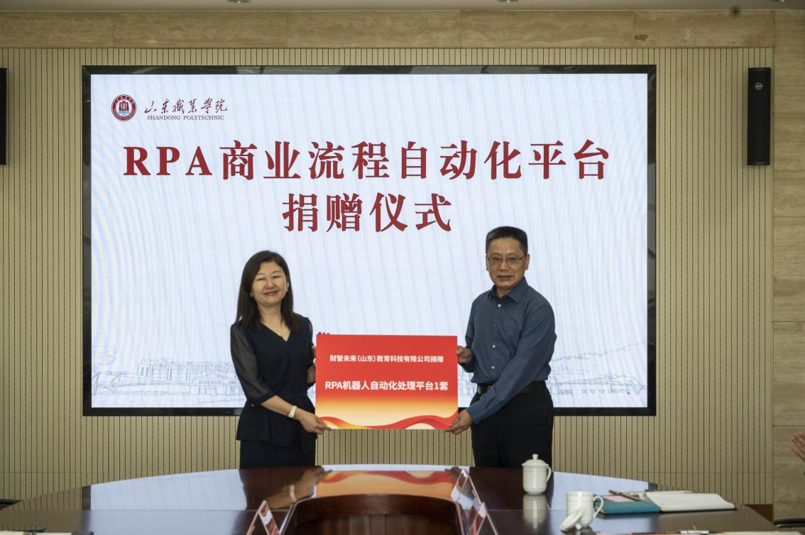 仪式上,财智未来(山东)教育科技有限公司向伟德管理学院捐赠了商业流程自动化软件资源,双方为“商业流程自动化科创融汇工坊”项目揭牌。