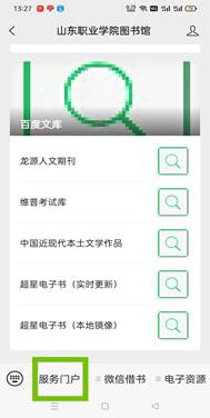 微信公众号的功能主要分为三部分:服务门户、微信借书、电子资源。