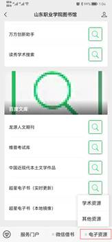 6.“电子资源”,访问所需要的电子资源,包括学术资源和其他资源两个功能。