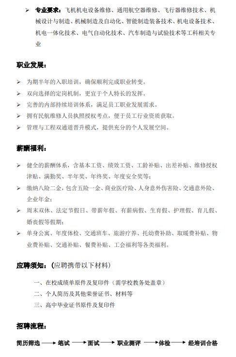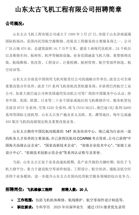 山东太古飞机工程有限公司招聘简章