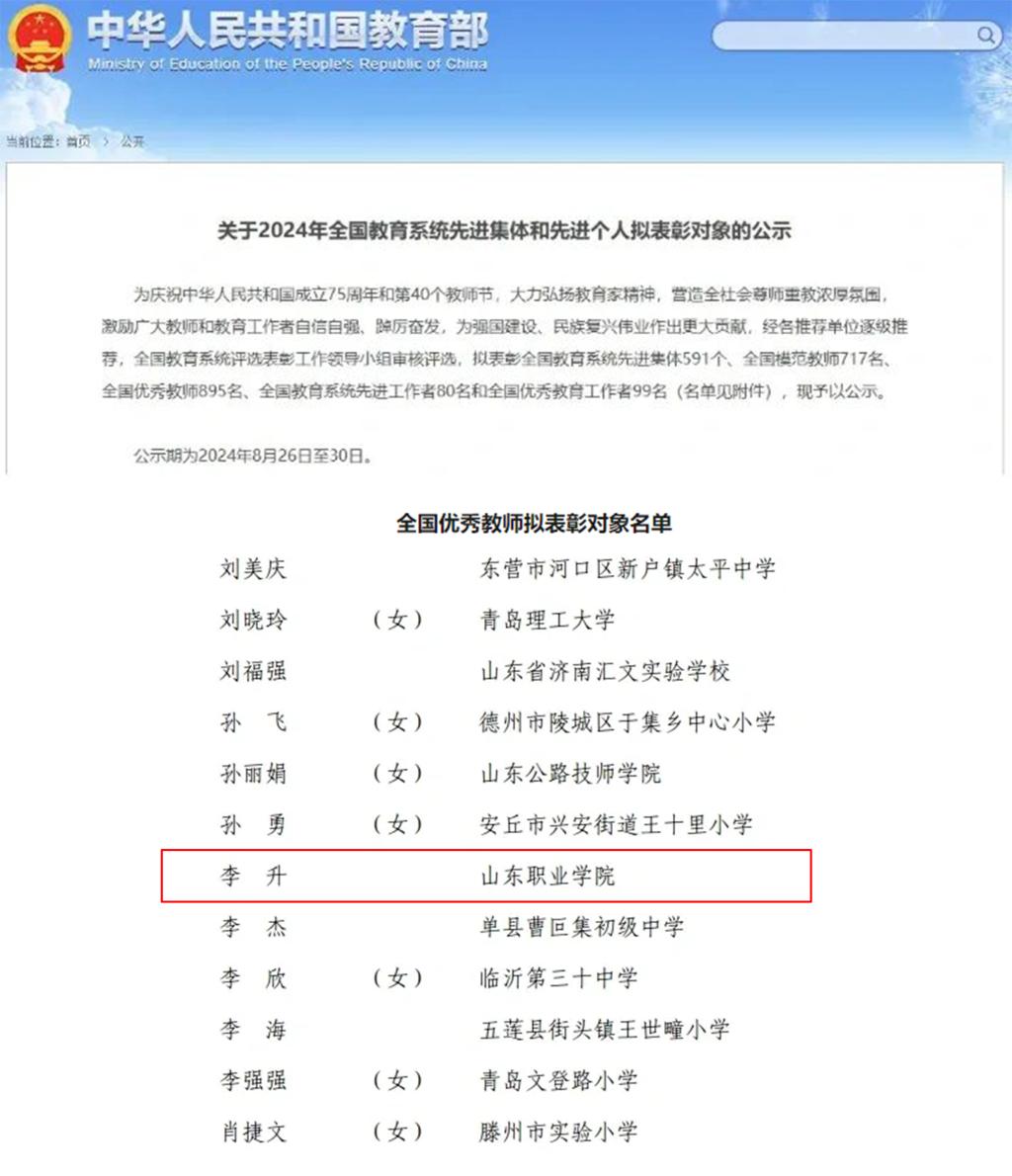 日前,教育部、人力资源社会保障部公示了2024年全国教育系统先进集体和先进个人表彰对象名单。伟德智能制造学院李升荣获“全国优秀教师”称号。