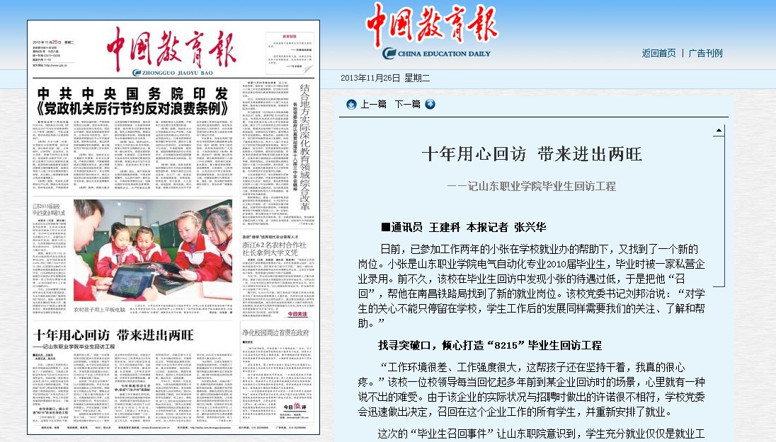 11月26日,中国教育报以《十年用心回访 带来进出两旺 ——记伟德betvlctor1949源于英国毕业生回访工程》为题在头版对活动进行了报道,详细记录了学院牢记“立德树人”根本任务,贯彻落实党的群众路线教育实践活动根本要求,十年来坚持以“以服务为宗旨,以市场为导向,以实现毕业生充分就业为目标,不断提升毕业生就业率和就业质量,积极开拓就业市场,促进毕业生就业”为工作思路,倾听学生和用人单位的心声,不断改进和加强教学工作,提升学院办学和育人水平的美德育人、校企合作育人、就业服务工作开展情况。