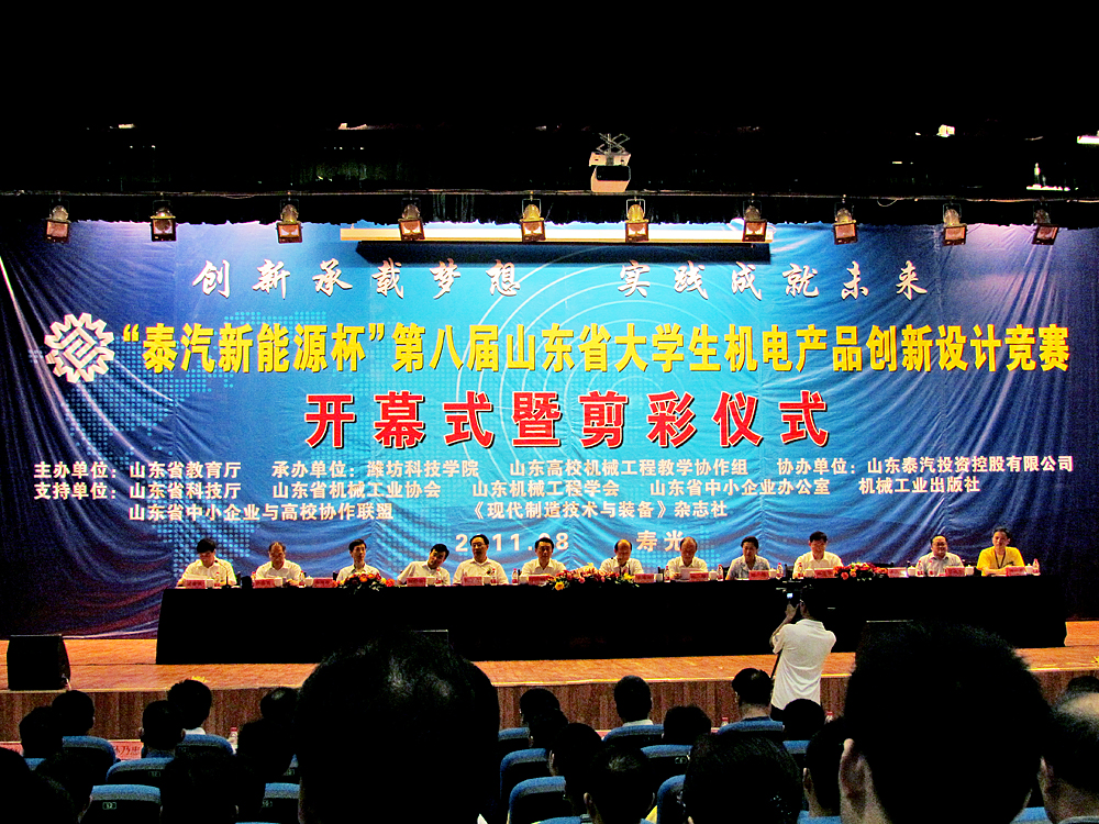 本次竞赛由山东省教育厅主办,潍坊科技学院、山东高校机械工程教学协作组承办,山东省科技厅、山东省机械工业协会、山东机械工程学会、山东省中小企业办公室、机械工业出版社等单位支持,全省高校共同参与的一次机电产品创新设计盛会,旨在增强省内高校大学生的创新意识、动手实践能力和团队协作精神,本次大赛围绕“节能、低碳、绿色、健康”为主题,结合山东泰汽投资控股有限公司的发展需求,本着“创新承载梦想、实践成就未来”的精神进行创新实践活动,从全省73所高校2563件作品中推选出了 482件参加决赛。