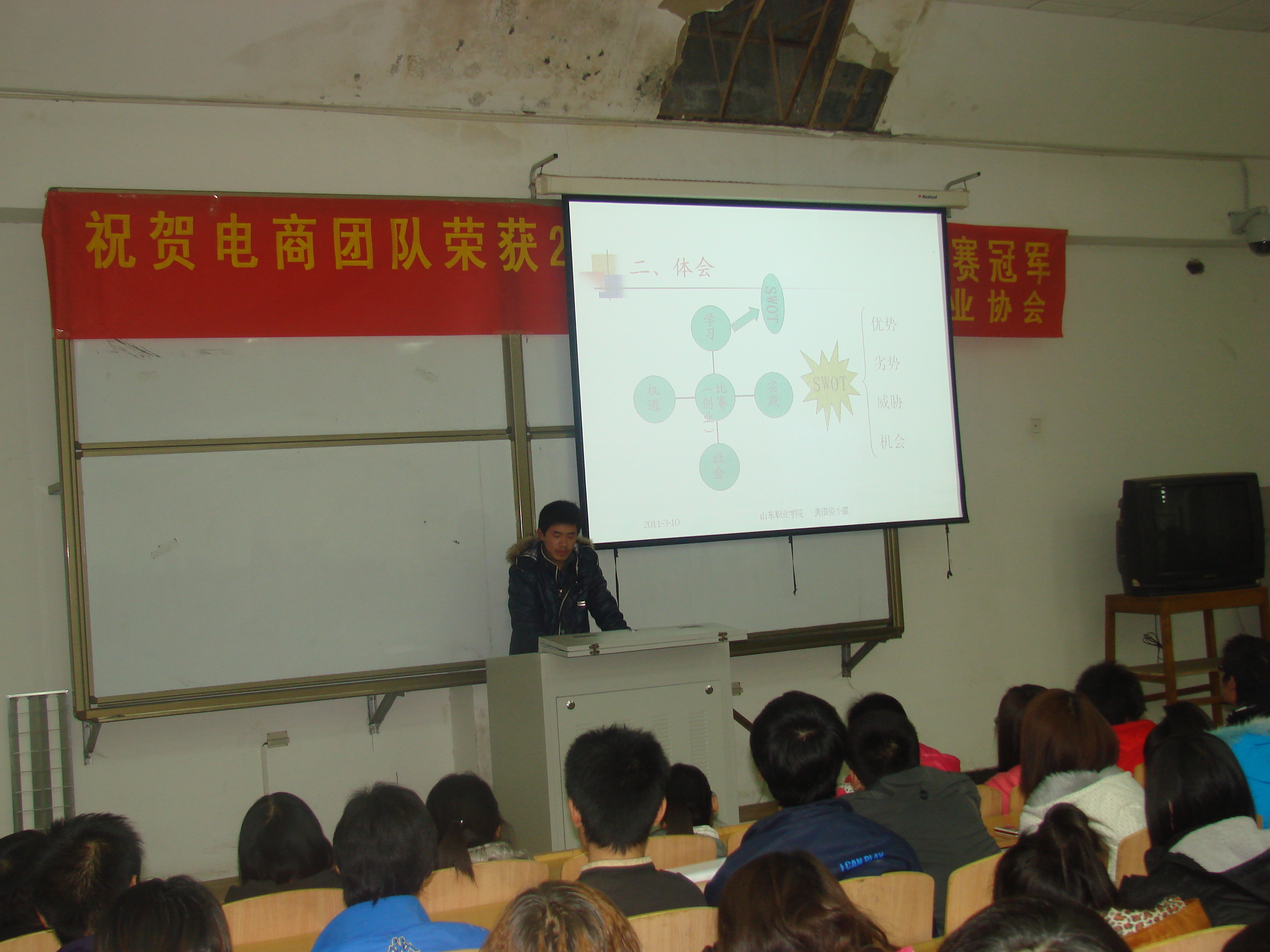 晚上7点报告会正式开始,偌大的教室座无虚席,首先刘老师对本届全国网络创业大赛进行了简单的介绍,并对电商团队在比赛中取得的优异成绩表示祝贺。他语重心长地说“能够做自己最喜欢的事才是最幸福的”,鼓励当代大学生敢于实践自己的就业与创业梦想。紧接着是在网络创业大赛中取得冠军的团队介绍他们的成功经验,冠军团队由队长韩明东发言,就团队店铺“优乐美”的创办历程、经营种类、参赛经历、获得成就等进行了讲解,最振奋人心的就是获得创业大赛冠军以及创业的第一桶金。他们获得的荣誉中包含了多少汗水与辛劳。场下的同学无不都被能吃苦、敢于创新、勇于拼搏的精神深深的打动着。本次我院共有4个电商团队参赛,在韩明东之后其他三队代表也分别讲述了他们为期2个月的参赛经历。各队精彩纷呈的网店令人赞不绝口,他们“日进斗金”的收获更是把报告会推向了高潮,现场笑声不断,掌声不断。最后持续了近两个小时的报告会在老师的总结和对同学们未来的期许下落下帷幕。为了满足更多同学的愿望,报告会于次日又进行了第二场。