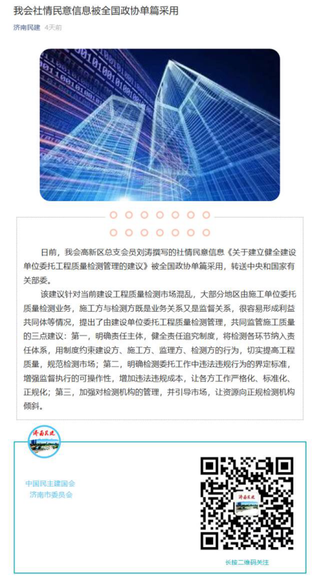 作为民主建国会会员,积极献言建策是义不容辞的责任和义务。为此,他向民建济南市委提出《关于建立健全“济南市建设单位委托工程质量检测管理”的建议》、《关于开放建工检测行业审批用地、促进行业规范化、产业化发展的建议》等提案,提案都得到了各级主管部门重视,其中《关于建立健全“济南市建设单位委托工程质量检测管理”的建议》被全国政协单篇采用,并转发有关部委。2018年,济南市高新区市场监管局专门为他颁发“高新区政风行风监督员”。