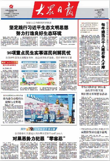 5月12日,《大众日报》在头版刊发文章《山东实施高校毕业生基层成长计划 每年遴选三千人建后备人才库》,原文如下: