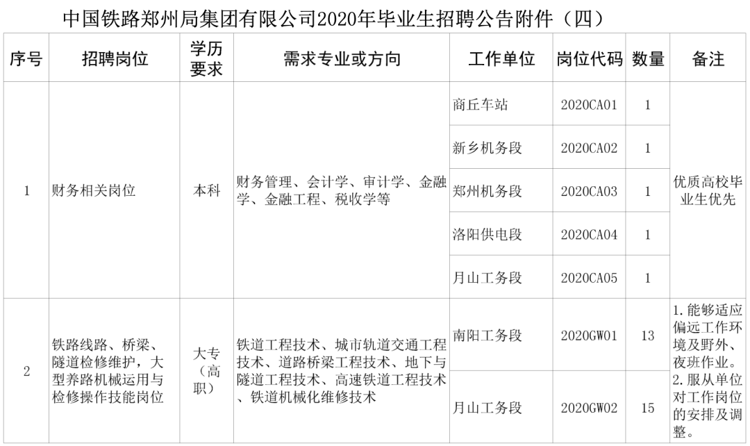 根据企业发展对人才的实际需求,中国铁路郑州局集团有限公司2020年拟招聘全日制普通高等院校毕业生,具体事宜公告如下:
