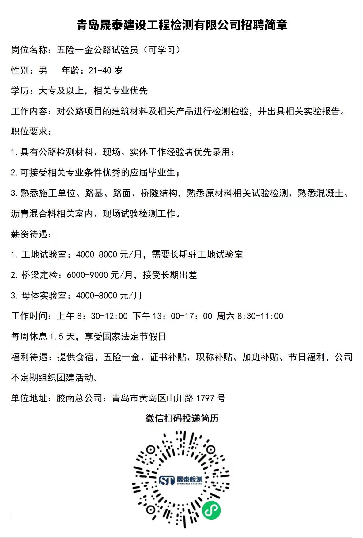 青岛晨泰建设工程检测有限公司招聘简章