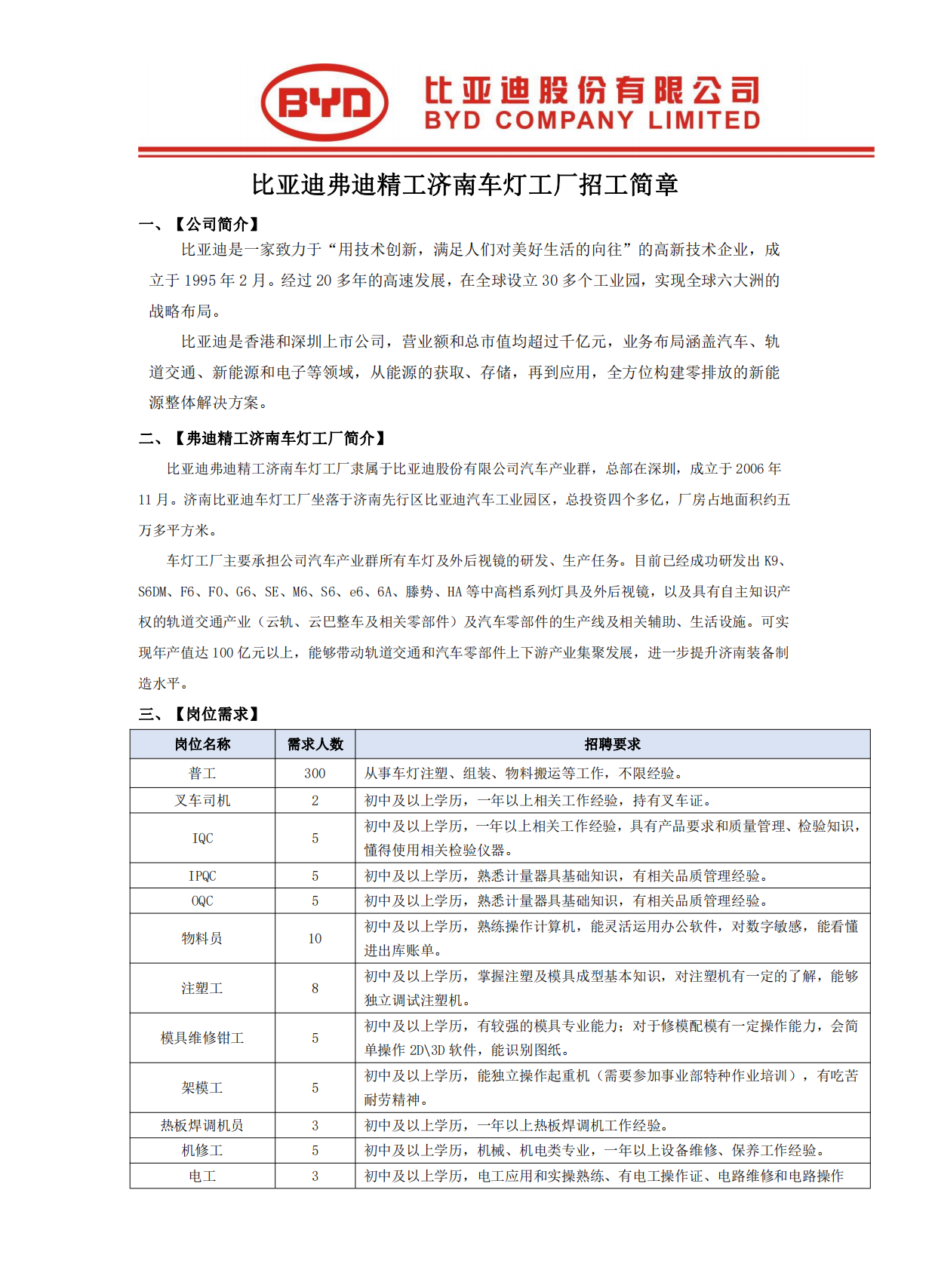 比亚迪弗迪精工济南车灯工厂招工简章
