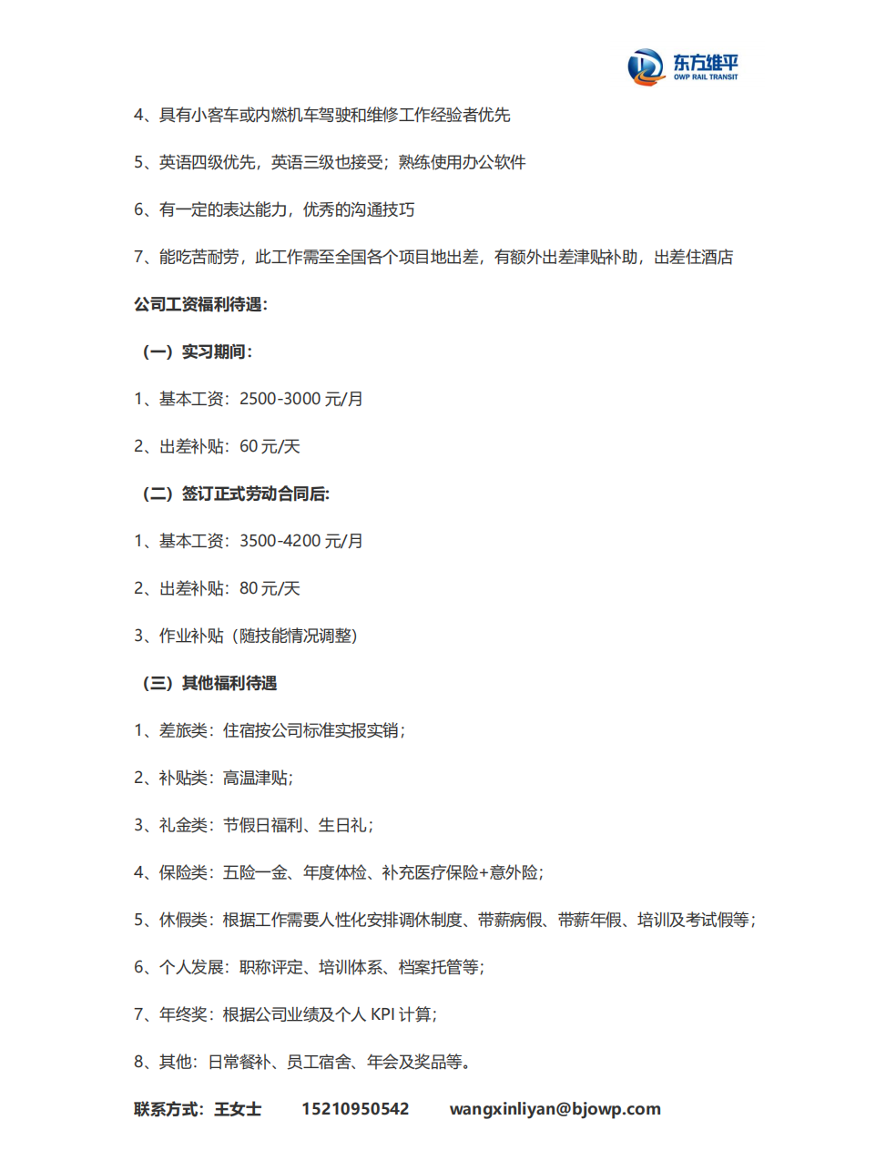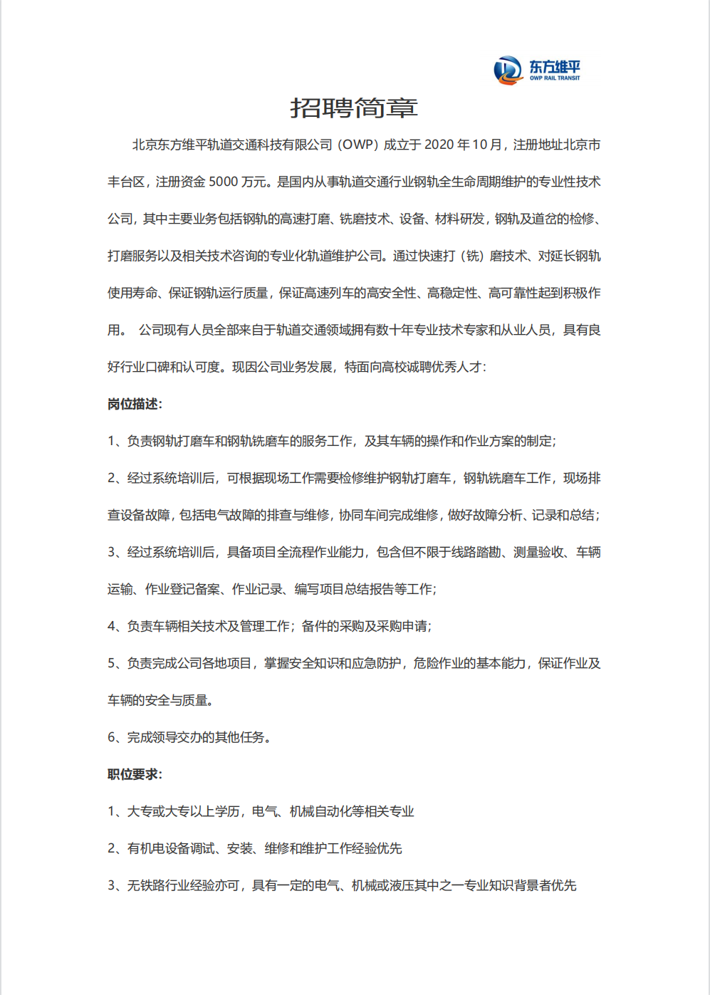 北京东方维平轨道交通科技有限公司2022年招聘简章