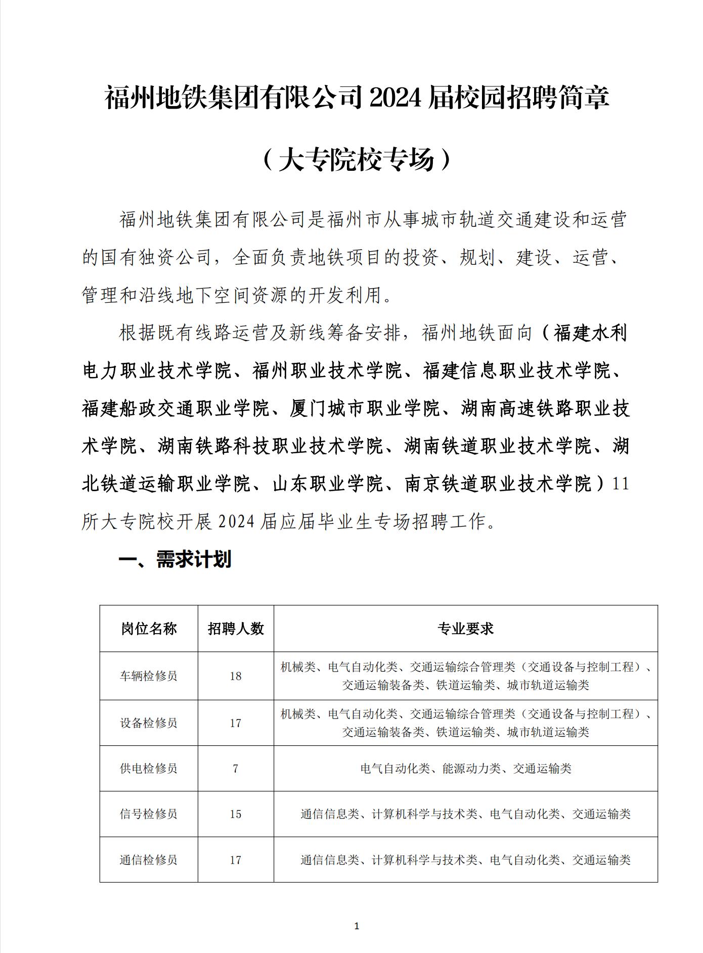 福州地铁集团有限公司2024届校园招聘简章