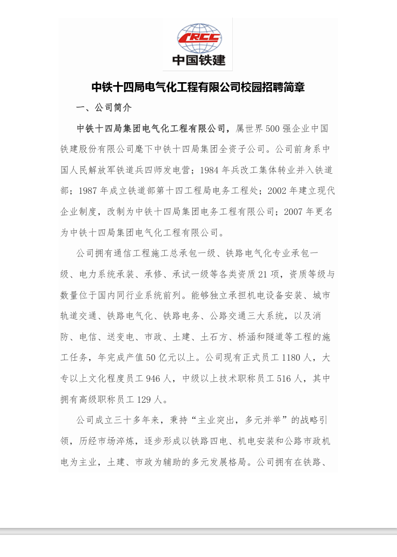 中铁十四局电气化工程有限公司2023年校园招聘简章
