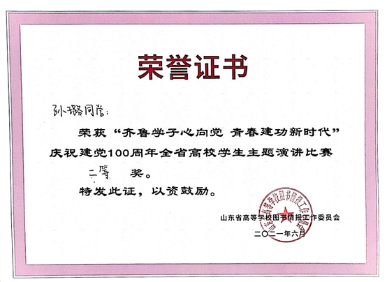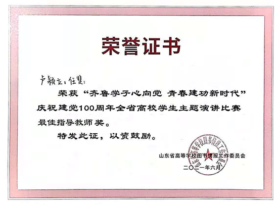 6月11日,由山东省高等学校图书情报工作委员会主办的“齐鲁学子心向党 青春建功新时代”庆祝建党100周年全省高校学生主题演讲比赛决赛在山东师范大学长清湖校区举行。全省共有36所高校参加决赛,伟德选手铁道机车1931班孙璐获二等奖,图书馆卢颖立获最佳指导教师奖。