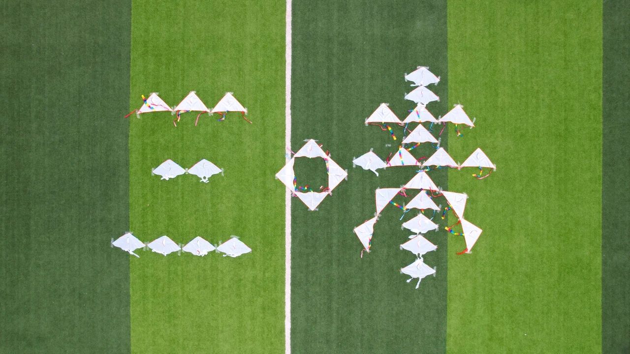 “线要慢慢放,感觉到拉力就加速!”同学们现场相互传授秘籍。从跌跌撞撞的“扎地风筝”到稳稳盘旋的“高空王者”,操场化作欢乐实验室。当亲手绘制的风筝终于触碰云朵,大家露出满意笑容。