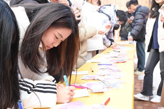 在喜迎新年的欢快氛围中,同学们利用手中的笔、贴纸在贺卡上描绘出美好的祝愿,展开对新的一年的期待。