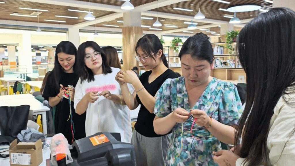 五彩绳编制过程中,同学们仔细将一条条彩色绳子编织出各种造型,随后将自己亲手编织的五彩绳佩戴在身上,或留存起来赠送给亲朋好友,传递节日的祝福。