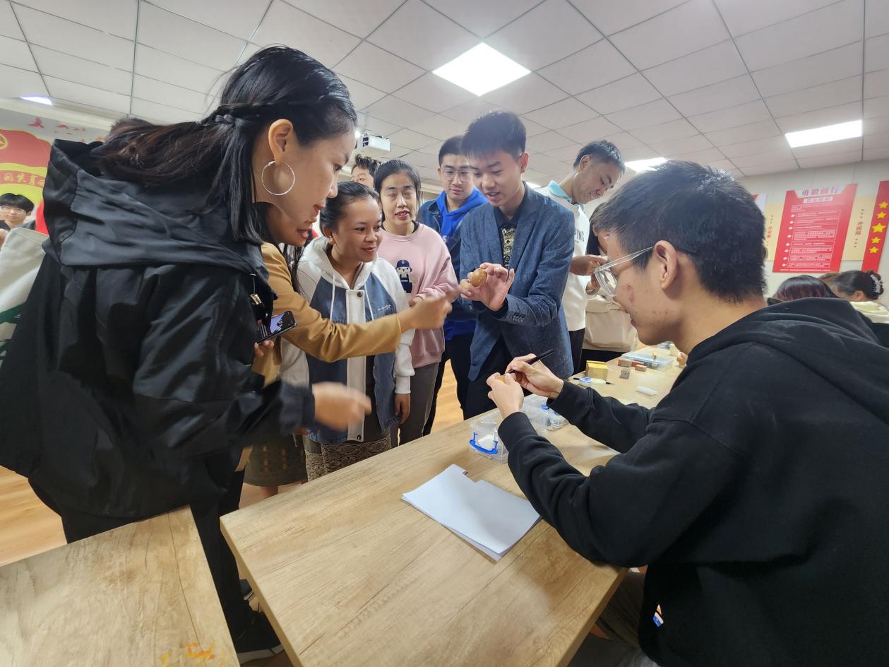 在南山书院党团活动室中设有互动体验区,沁心茶社、笔韵书香社、沁心手工坊和非遗传习社等社团的同学们现场展示蛋雕、篆刻、衍纸、剪纸等文化手工技艺,还有同学们动手制作的手绘扇子、书签、手工编织袋等工艺品赠送。观展的师生们一边品茶,一边亲身体验篆刻技艺,加深了师生对中华传统文化的认知与了解,展现了新时代青年学子对艺术的热爱、对传统工艺的坚守与传承。