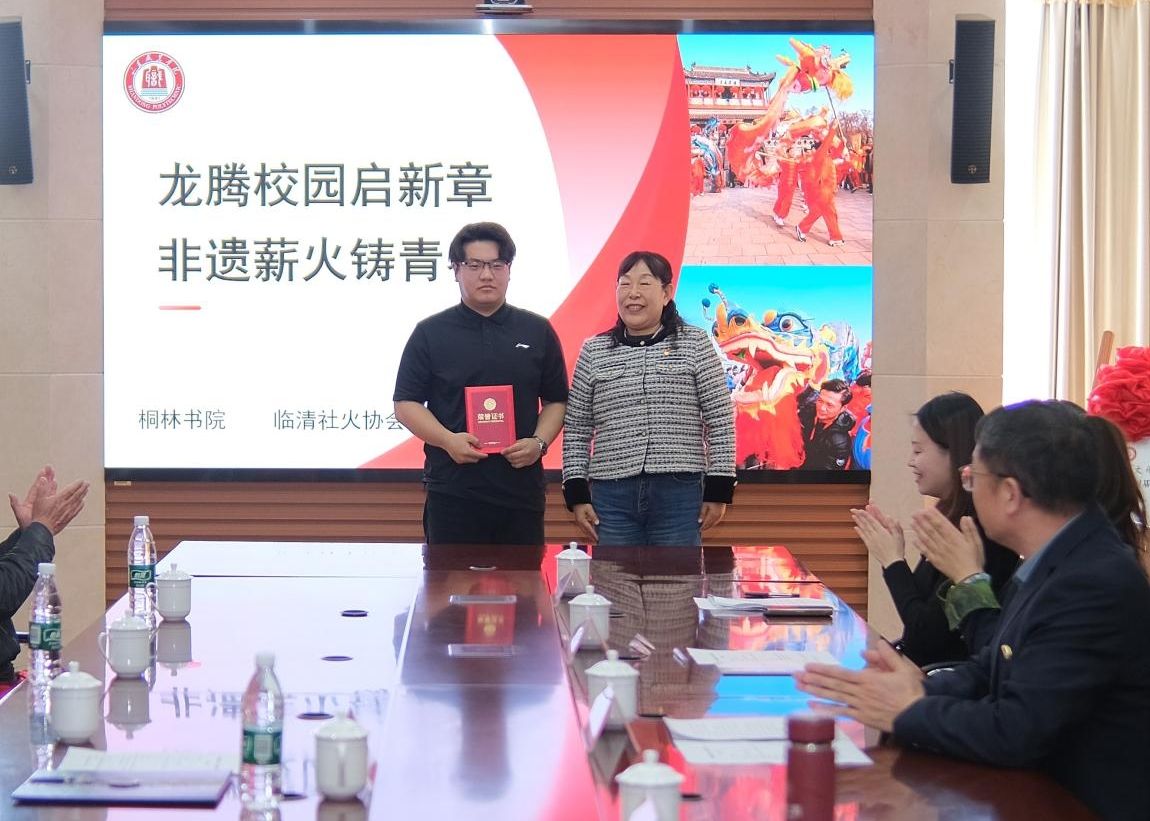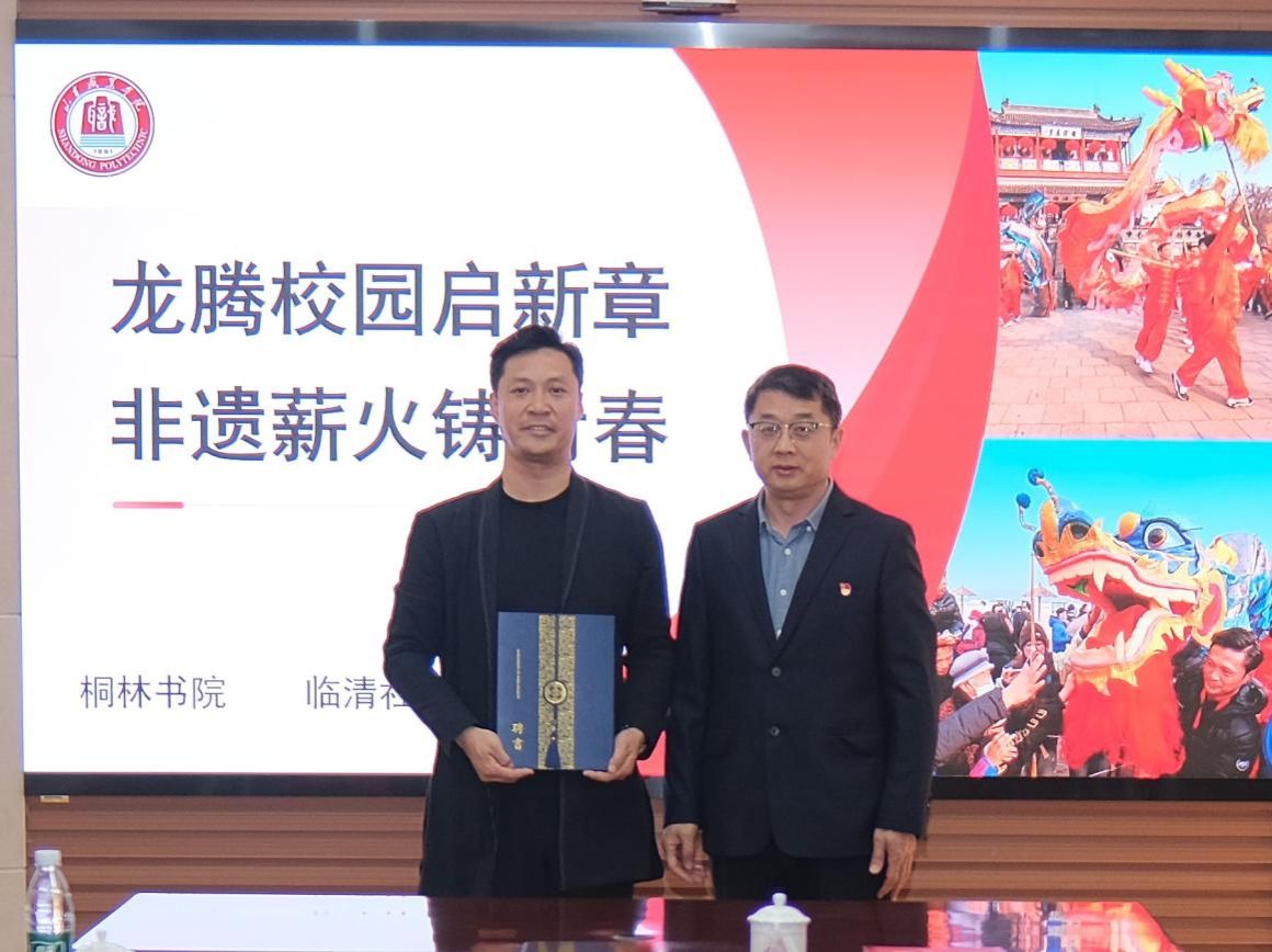 活动伊始,桐林书院院长郭兆军致辞,首先对临清市社火协会的到来表示热烈的欢迎和衷心的感谢,体育美育教学部主任国翠香详细介绍了学院传统文化育人体系及非遗项目建设成果。双方就传统文化的发展与传承举行座谈会。会上,省级非遗临清龙灯传承人侯少坤生动介绍这项起源于明代的民间艺术所承载的文化基因与精神密码,强调“让青年成为非遗活态传承的火种”的时代价值。