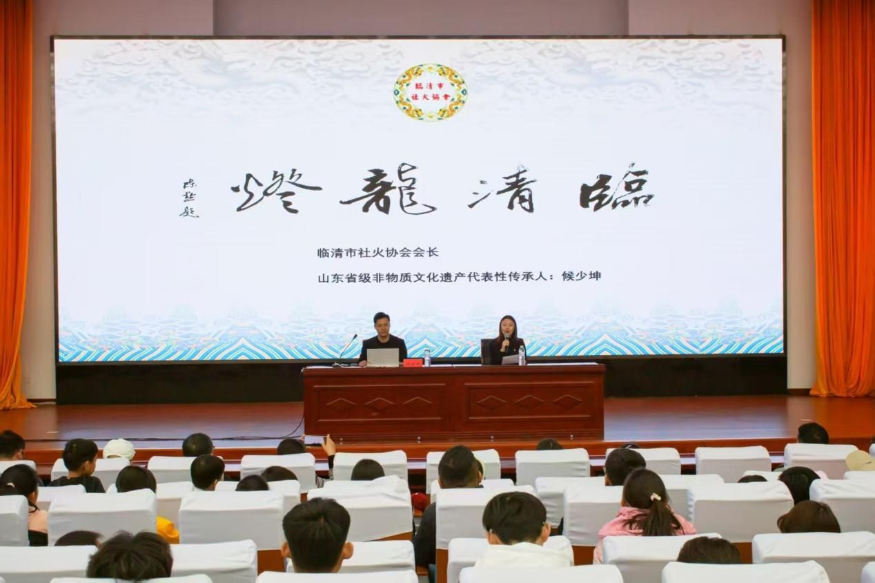 活动伊始在图书馆行政楼西报告厅开展了“龙腾校园启新章,非遗薪火铸青春”主题讲座,讲座由桐林书院团总支书记赵呈然主持,山东省级非物质文化遗产代表性传承人侯少坤主讲,侯少坤介绍了非遗项目舞龙的起源、发展脉络与文化内涵,强调在实践中感受非遗魅力,传承非遗文化。随后,临清社火在喷泉广场开展舞龙表演并耐心教学舞龙的动作要领,小朋友们纷纷拿起工具,亲自体验传统技艺的深厚底蕴。