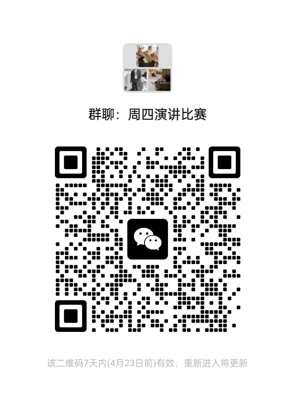 书院定于本周四下午进行“国家安全,青春担当”主题的演讲比赛,资料自行准备,大家让参加的同学进群,报名时间截止到明天中午12点半。