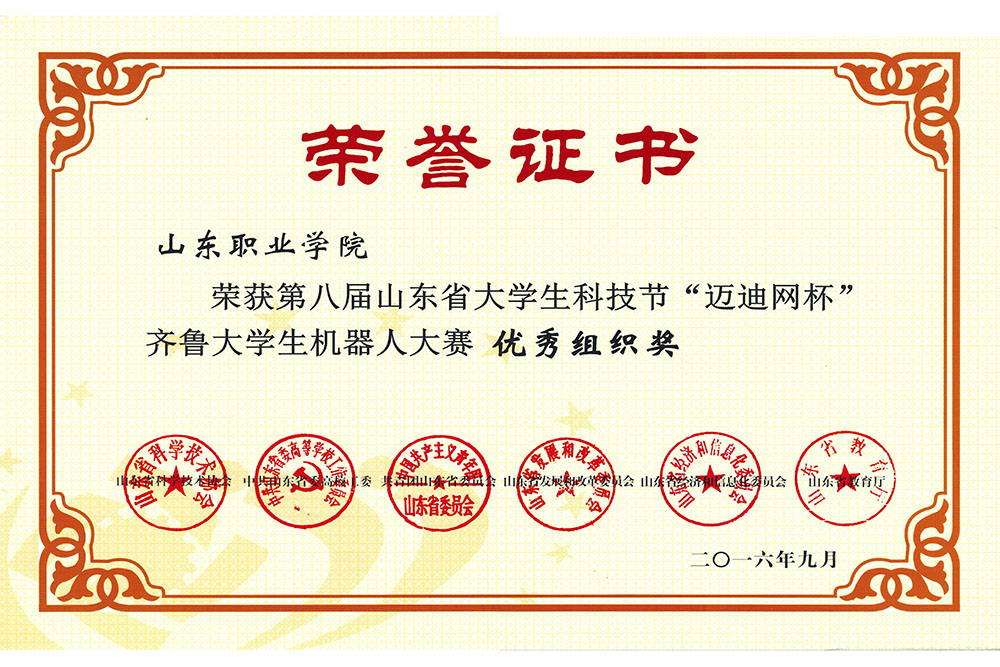 在9月份举办的第八届山东省大学生科技节“迈迪网杯”齐鲁大学生机器人大赛上,由我院张为宾、徐瑞霞、宋嘎、戈立江、陈月凤等5位老师带领的大学生创新团队喜获一等奖1项、二等奖4项。此外,我院荣获大赛“优秀组织奖”。