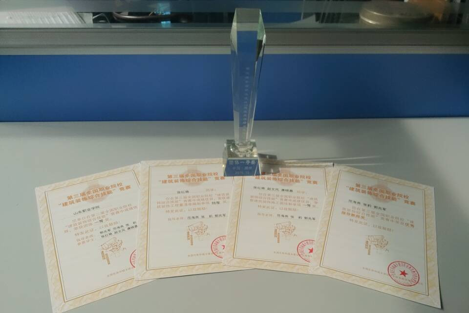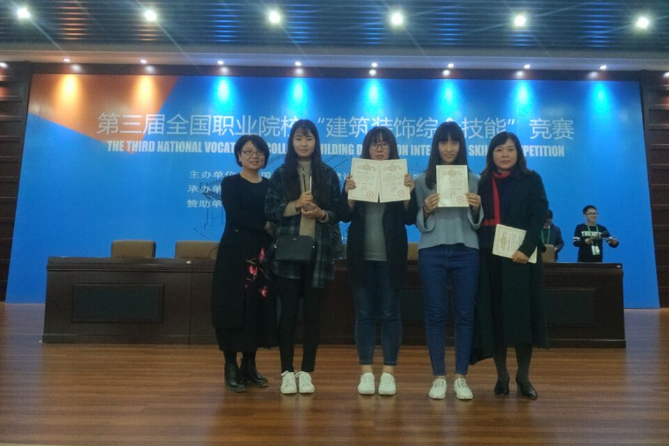 在第三届全国职业院校“建筑装饰综合技能”竞赛上,由我院带队老师范海燕、张莉指导的建筑装饰14级参赛团队(学生:张红艳、赵文风、唐晓嘉)喜获“团体一等奖”、单项特等奖1项、一等奖2项、二等奖1项的好成绩。