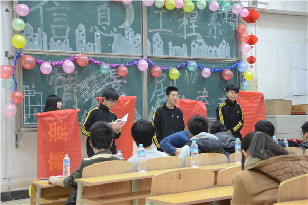 12月8日,信息工程系成功举办了2013级宿舍情景剧。比赛在3209如火如荼的展开了,本次大赛由自律会主任以及各部部长、学生会主席、团总支、学生会各部部长、社团联合会主席出席并担任评委。