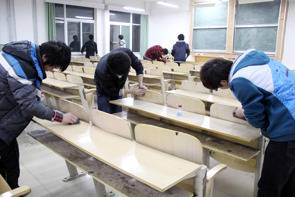 此次活动主要是清理机电系的公共自习教室。活动开始前,机电系学生干部召开动员会,并将活动的具体事项、人员分工等问题一一下达。在整个活动过程中,同学们分工明确,默契合作,都积极服务在整个志愿活动中,将桌面、地面上的污渍等清理的干干净净。活动后,每个同学们的脸上丝毫没有抱怨和劳累的神情,而是洋溢着幸福满足的笑容。一名青协志愿者说到,做志愿活动,让我们认识到,有些事情是我们很轻松就能做到的,而这些小事却会帮到别人很多很多。
