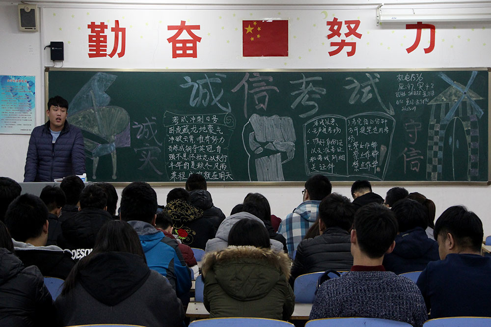 为严肃考风考纪,加强诚信考试教育,近日,铁道机车与机电装备系召开了“诚信考试”主题班会,同学们各抒己见,积极参与班会讨论。 机电1631班焦宪良表示,同学们应增强诚信意识,认真准备,积极备考。机电1632班集体学习了学院关于考试作弊处理的相关规定,要求大家要严格遵守考场纪律,独立完成考试。最后该班全体同学还签订了“遵守考场纪律,坚决抵制作弊”承诺书。