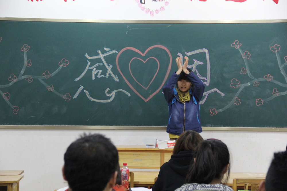 该班的郑志荣同学伴随感动的旋律,向同学们展示了手语操。她说,鸦有反哺之义,羊知跪乳之恩。在父母的襁褓下生活了这么多年,就应该懂得感恩,而现在只要抽出时间给父母打电话报平安,他们就会感觉非常幸福。