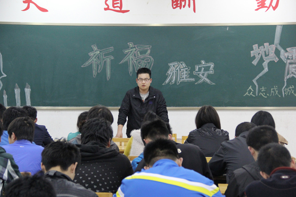 4月20日,四川雅安发生里氏7.0级地震。为了表达对灾区人民的牵挂和祝福,4月23日,机电装备系组织开展“为雅安祈福”主题班会活动。 班会伊始,同学们肃立哀悼地震中遇难同胞,并十指交叉为雅安祈福,衷心祝愿灾区人民尽快渡过难关,重建美好家园。接下来,同学们观看了雅安地震视频和灾区军民抗震救灾救援的画面,了解震后当地学校以及群众受难后的场景,感受全国人民“众志成城,抗震救灾”的坚定信念。同学们认真听取,积极发言,阐述了自己对抗震救灾的看法。有的同学说到,献血车开进了校园,我们可以通过献血为雅安做贡献,我们献出的血虽然不多,但关键时刻能够挽救一个生命。 最后,各班开展了地震知识小问答,温习了防震减灾常识,进一步增强了同学们的防震意识,提高灾难时的避险和自救能力。地震无情,人间有爱。只要人人都献出一份爱,雅安的明天将会更加美好。