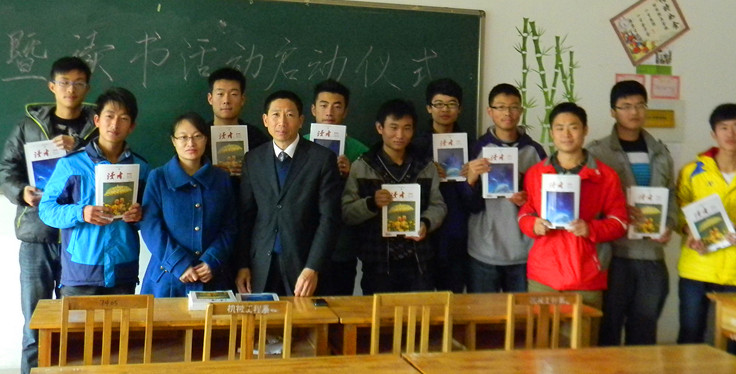 11月21日,机械工程系举行《读者》授书暨读书活动启动仪式,机械系学工办主任杨廷富、团总支书记刘娟向2012级新生代表赠送《读者》。