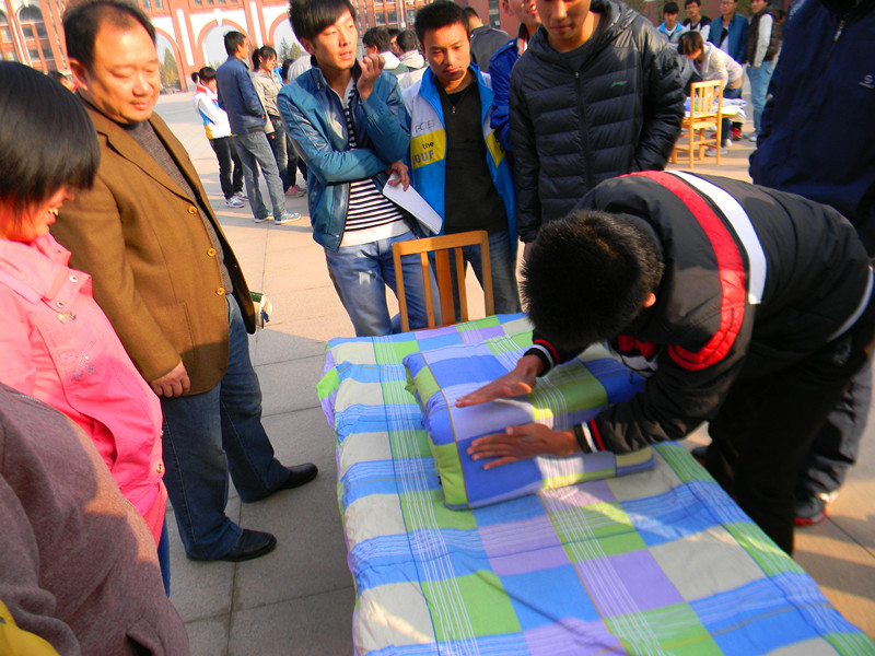 比赛开始后,参赛队员立刻投入到紧张的叠被比赛中,掏被子、捏边、抠角、整平,一个个细致入微的动作,一张张严肃认真的面容,从中体现出的是新生的细心认真、务实肯干的精神品质。比赛中,工作人员认真的做好叠军被的监督计时工作,确保在此过程中公正公开,避免场外援助、使用违反规定的工具等作弊现象的发生。在比赛过程中,参加本次活动的评委及嘉宾还亲自上场叠军被,为参赛队员做出了标准的示范。本次大赛共评选出了一个一等奖、两个二等奖、三个三等奖以及一个团体奖。