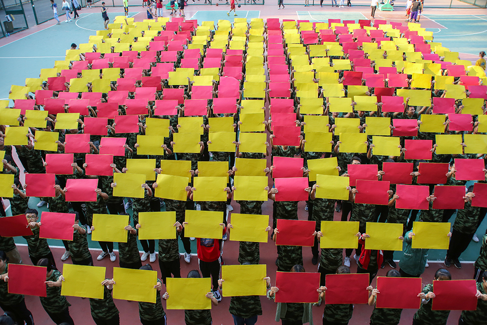 新生们通过手中红黄两面方形板的交替翻转,随着音乐的节奏和变换不停翻动着,依次摆出“1949” “2019” “70” “我” “爱心” “中国”等图案,献礼新中国成立70周年。