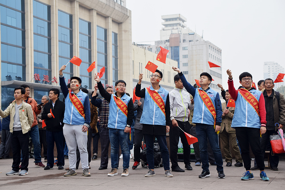青年志愿者们积极维护广场秩序,让旅客们有序观看十九大开幕盛况,并为旅客发放手持国旗和国旗贴,营造喜庆氛围。志愿者与游客们挥舞着国旗,唱着国歌,谈祖国发展,谈身边变化,谈幸福生活,谈未来憧憬,脸上洋溢着自豪与骄傲。志愿者与旅客还将“国旗贴”贴在自己的胸口上,齐声说道“一心向党,不忘初心跟党走”,并伸出大拇指为祖国加油点赞。