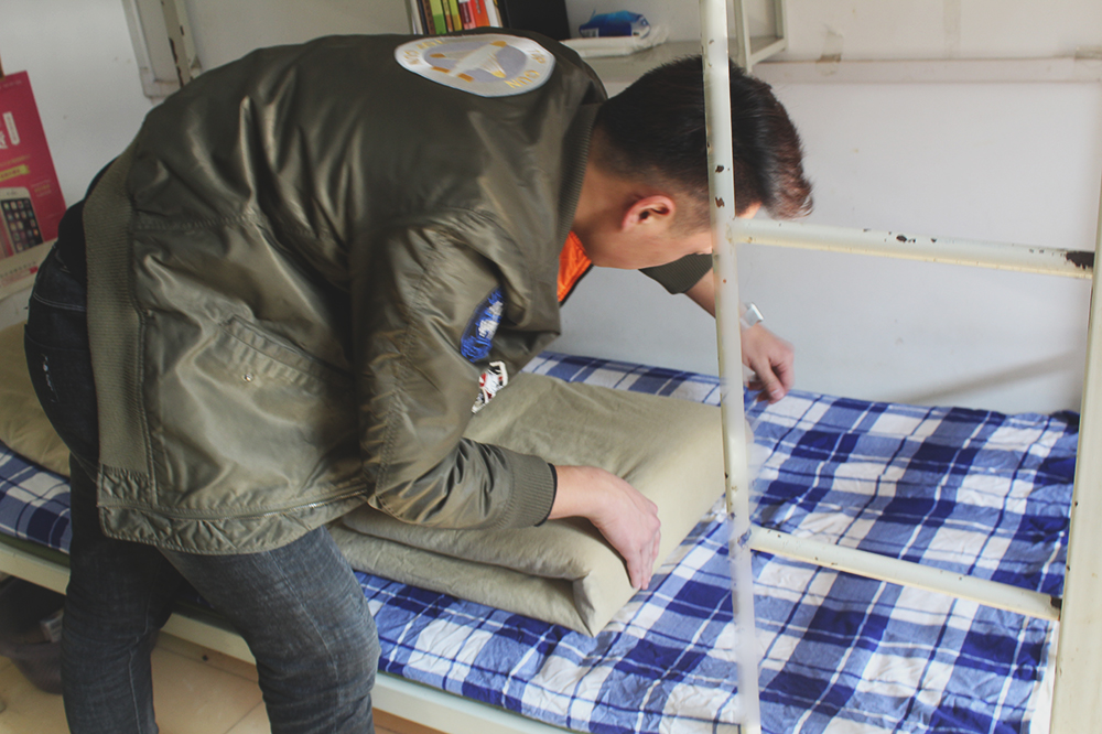 曾服役于中国人民解放军空军某部的退役军人李秉昌,两年的军旅生涯造就了他过硬的作风与内务整理的好习惯。他讲到,叠被子有四个步骤。首先,将被子平均分三份,取两端约三分之一按中间线对折两次;然后,在被子前后端分别卡出两条距离约10厘米的平行线后,向内对折;接着取被子中间两条约20公分的平行线将被子前后端扣在一起,约成一个长方体;最后进行整体修整,使被子前端长度、短度上下统一,三条线平行。一个“豆腐块”就诞生了。李秉昌一边讲解一边进行示范,把细节一处不落地讲解给同学。李秉昌表示,“三分叠,七分整”,多下功夫才是根本。
