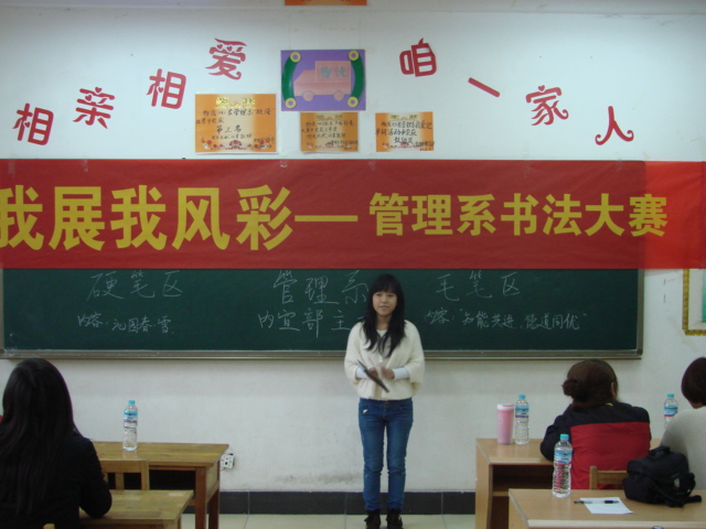 为选拔优秀作品和优秀人才,进一步丰富同学们的课余生活, 10月23日,管理系举办“展我风采”艺术书法大赛。
