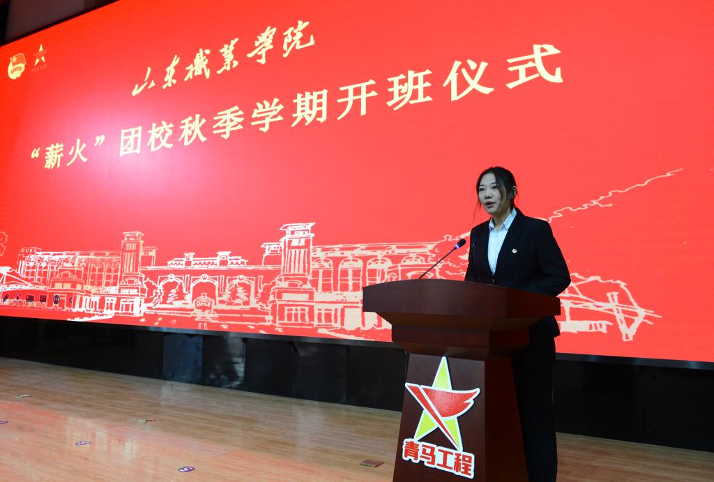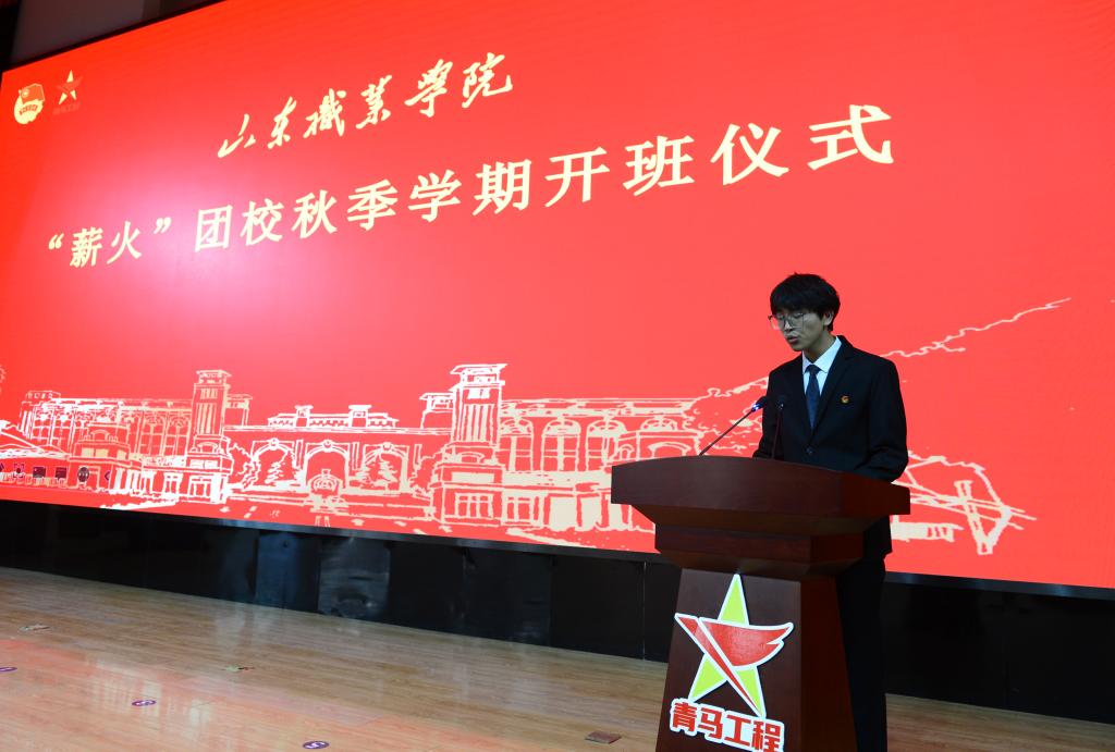 学生工作处处长王辉宣读《关于山东职业学2022-2023“薪火”团校春季学期团学骨干能力提升进修班暨第十一期青马工程培训班准予结业和表彰先进的决定》。