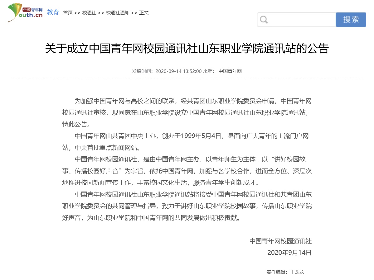 为拓展宣传报道伟德新闻渠道,加强中国青年网与高校之间的联系,经学校党委宣传部、共青团伟德betvlctor1949源于英国委员会联合申请,中国青年网校园通讯社审核,于9月14日成功申请建立中国青年网校园通讯社伟德betvlctor1949源于英国通讯站。今后,本通讯站将通过中国青年网、三下乡官网、中青校园等平台进行校园新闻宣传工作。