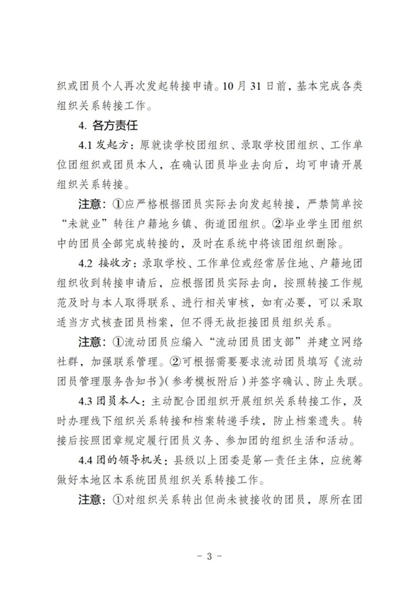 要以高度的责任心认真做好毕业学生团员的组织关系转接工作,熟悉政策规定和操作流程,为团员提供贴心服务。对于不符合转接规定的,要耐心解释说明,坚决防止和纠正“一拒了之”“一刀切”等简单化做法。
