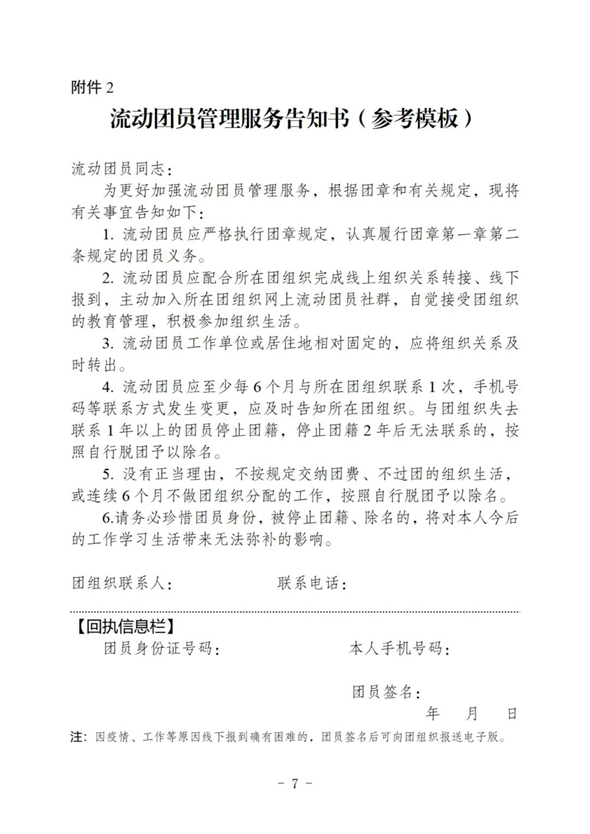 答:为防止团员“在网失联”,团组织可根据需要要求流动团员填写《流动团员管理服务告知书》并签字确认,强化团员身份意识、告知流动团员义务责任。比如,转入乡镇(街道)、村(社区)团组织但本人并不在当地的流动团员;毕业后组织关系仍保留在学校的流动团员等。因疫情、工作等原因线下报到确有困难的,团员签名后可向团组织报送电子版。