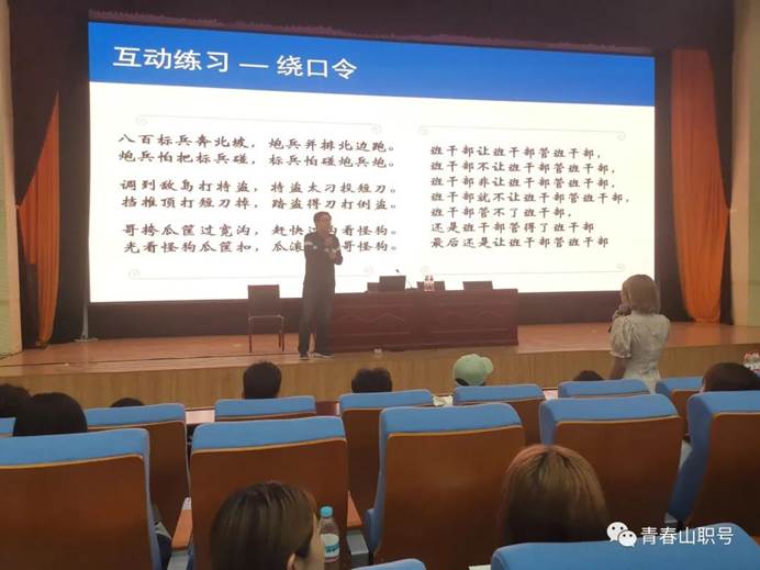 智勇老师从自己在山东广播电视台的工作经验开始谈起,讲述了合格播音员的基本素养,发音、坐姿、站姿、备稿、熟悉舞台环境、克服上台紧张情绪等等。亲自示范发音练习中的各种小技巧,如打开口腔、绕口令、气息控制、生僻字词练习等,真正做到了以身作则,亲身指导。