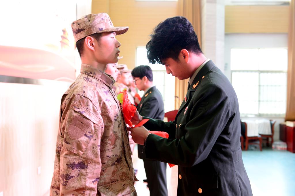 欢送会上为应征入伍学生颁发了纪念品。退伍学生为新入伍学生佩戴了光荣花,退伍学生代表袁培硕分享了自己的军旅感受,即将入伍学生代表张昊表达了参加入伍、保家卫国的决心和信心。